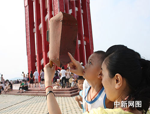 從21晚10時(shí)開始,陸續(xù)有民眾登上當(dāng)?shù)刂包c(diǎn)鳳凰山,等候日全食。22日7時(shí)許,記者在鳳凰山上山沿途看見數(shù)以萬計(jì)的民眾扶老攜幼,手持X光片、電焊防護(hù)鏡、黑色玻璃片、水盆等觀看工具,在鳳凰山上尋找最佳觀看位置。