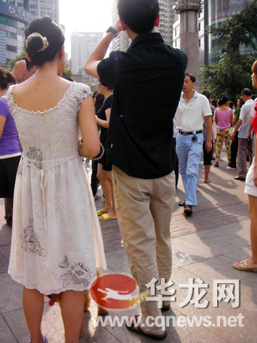 記者在觀音橋步行街就發(fā)現(xiàn),上午來廣場上看日全食的情侶還真不少,大家都有備而來,準(zhǔn)備好相機(jī)和日全食觀測鏡,記錄下浪漫的一刻,甚至有的情侶還帶上家里的小寵物,共同關(guān)注日月同輝。