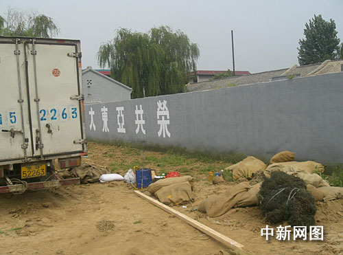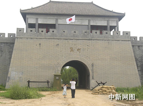 兵法城是該市的一個(gè)旅游景點(diǎn),城門口進(jìn)出的行人很多,很多人對(duì)城門上的日本國(guó)旗議論紛紛,還有一些市民掏出手機(jī)進(jìn)行拍照。走進(jìn)兵法城,記者看到院子里有很多“彈藥箱”之類的東西,還有幾個(gè)工人在平整院子,墻壁上刷有“大東亞共榮”的字樣,一問(wèn)才知道是在拍攝電影。