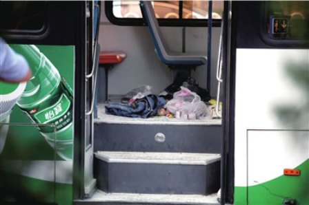 記者看到,公交車前車門處滿是灰色粉末,一條淡藍(lán)色牛仔褲、一袋蘋果和一些塑料袋堆在車門附近。附近居民猜測,那里正是嫌疑人意圖縱火的位置,“警察一直在那附近拍照,那些東西可能也是救火時留下的!