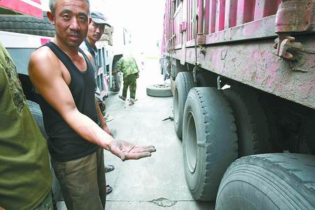 約半小時后,記者趕到京港澳高速鄭州東服務區(qū)。西側服務區(qū)停車場里,仍停有七八輛被扎破輪胎的貨車,每輛車被扎爛輪胎1至3只不等。司機們一籌莫展,不停嘆氣。