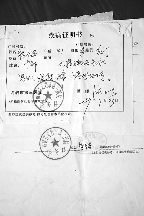 2009年7月18日,程天富從精神病院第四次出來,擔心呆在長汀還有被抓進精神病院的危險,但又無法證明自己沒有精神病,遂到龍巖的醫(yī)院就診。