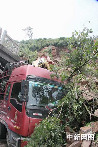 在事故現(xiàn)場,記者看見塌方路段有一百多米長,整個山體像被刀削似的,上面的石頭搖搖欲墜,樹木折斷,道路堆滿石頭,兩輛貨車和一輛面包車遇險并不同程度受損。二十多臺機械設(shè)施以及公安、消防等近二百名救援人員正在緊張的施救之中。