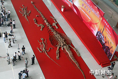中新網(wǎng)北京8月18日電 (記者 孫自法)三具侏羅紀時期的恐龍化石,十八日下午在它們的“新家”——中國科學技術館新館揭開“紅蓋頭”,正式由云南省楚雄彝族自治州“嫁”入北京落戶中國科技館新館,并將于下月中旬新館開放后進行永久性展出。