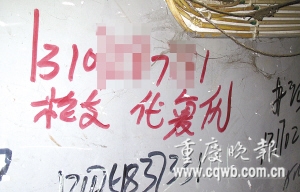 前日上午,記者在彭水縣文化館一居民帶領(lǐng)下,來到該館二樓轉(zhuǎn)彎處,墻上滿是“辦證”、“貸款”等牛皮癬,其中有兩塊內(nèi)容最雷人:“131072×××××,迷藥、槍支”、“131072×××××,槍支、代復(fù)仇”(右圖)。