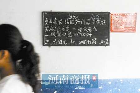 李先生是這棟樓的房東,身后墻壁掛的黑板上,寫(xiě)著一則通知:“夏季來(lái)臨請(qǐng)鎖好門(mén)窗,如果誰(shuí)家物品丟失:一、通知房東;二、報(bào)警電話(huà)65718584;三、不準(zhǔn)打110,如誰(shuí)打罰500元!