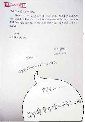 去年12月8日,李先生到法院查閱案件材料時,在一份起訴狀的末頁,看到有人在空白處寫下了兩行文字。上一行寫著“狗日的”字樣,下一行則寫著“沒有需要補償?shù)牧x務(wù)、事項和理由”字樣(見左圖)。夫妻倆認為,有人誤導和左右了此次判案。