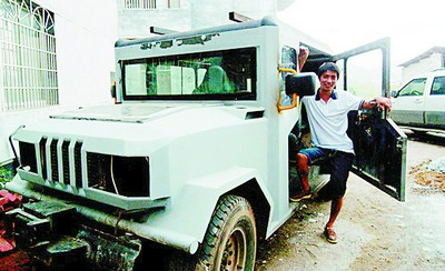 “我是今年4月份開始造這輛車的!比ツ陾顐悅ベI來一輛二手越野車開,車子老是出問題,他便有了自己造一輛車的大膽想法。他從網(wǎng)上下載“悍馬”圖片,一邊研究一邊創(chuàng)新。設(shè)計(jì)圖出來了,他拆卸了一輛進(jìn)口三菱車的底盤,買來配件,自己搭造骨架、焊接外殼,他還特地跑到車輛修理廠“偷師學(xué)藝”,終于造出“悍馬”。
