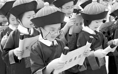 9月1日,杭州紫陽(yáng)小學(xué)舉行了一場(chǎng)特別的新生入學(xué)儀式。小學(xué)新生穿戴著類(lèi)似影視劇中的清朝衣服、帽子,手捧黃色書(shū)卷,誦讀入學(xué)三字經(jīng),向師長(zhǎng)行禮。