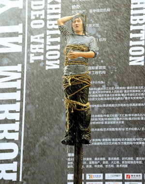 37攝氏度的高溫下,26歲的王軍被綁在近10米高的柱子上,先是被酷熱“折磨”了半小時,后又被環(huán)衛(wèi)車的水龍頭沖淋了半小時,耗費了8噸自來水,總共耗時兩小時。這個名為《守望》的行為藝術(shù)作品昨天下午在黃桷坪102藝術(shù)區(qū)雷倒了不少人。