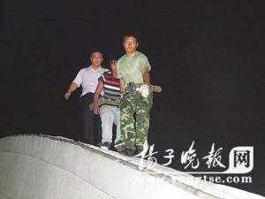 此時(shí),丹陽(yáng)市副市長(zhǎng)、公安局長(zhǎng)張劉茍獲悉后也火速趕到現(xiàn)場(chǎng)指揮救援。由于現(xiàn)場(chǎng)光線不足,救援人員只能模糊地看到高處男子的身影。為了防止男子做出不冷靜的動(dòng)作,救援人員沒(méi)有貿(mào)然行動(dòng),而是在該男子可能掉下來(lái)的地方鋪設(shè)救生氣墊以及架設(shè)起10余張安全網(wǎng)。此時(shí),在云陽(yáng)大橋下的大運(yùn)河中,聞警出動(dòng)的水上派出所的搜救隊(duì)隊(duì)員也已穿好泳衣,隨時(shí)準(zhǔn)備下水救人。海事部門、路燈管理所和120救援人員也被調(diào)集至現(xiàn)場(chǎng),嚴(yán)陣待命,現(xiàn)場(chǎng)彌漫著緊張氣氛。