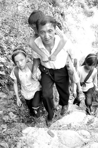 這是王正龍27年來唯一打的退堂鼓,仙峰苗族鄉(xiāng)中心校校長陳于強稱,對于王老師的“正常想法”,他們左右為難。“我舍不得孩子們,但是我一個大男人靠工資吃不飽飯,我還要孝敬老人、養(yǎng)兒養(yǎng)女!”王正龍的話“刺痛”了陳于強!澳悴淮n了,一時沒人接替你,我們只好撤掉兩個年級,有條件的孩子只能下山來讀!标愑趶姵聊艘魂嚭笳f。 “下山來讀?說得輕巧。”王正龍急了,這樣肯定有70%的孩子會輟學(xué),“我繼續(xù)教吧!山區(qū)的孩子不能沒有老師!”長嘆一口氣,王正龍又爬山路返回村小。