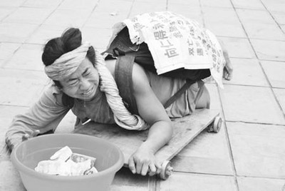 下午4時許,中年男子將自行車藏在樹后,變成一名衣衫襤褸的乞討者出現(xiàn)在眾人眼前。他趴在一個木板上,木板下邊有4個小輪子,他用胳膊和右腿支撐地面,身體通過滑板向前滑動。他的背上還貼著一張寫有“痛苦家世”和“悲慘往事”條幅。他滿臉淚痕,伴著嗚嗚的哭聲,引來很多行人關(guān)注。記者看到,短短5分鐘內(nèi),就有十幾名市民把錢放入他面前的塑料盆中。