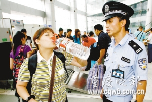 昨日下午2時許,(重慶市)龍頭寺候車廳檢票處,凡是拿著礦泉水瓶進站的乘客,都要先喝一口,然后才能順利進站。據(jù)悉,這是重慶鐵路公安處新出臺的安檢規(guī)定:凡液狀體物品進站,一律開瓶檢查,而自帶飲料的,則必須親自喝一口。