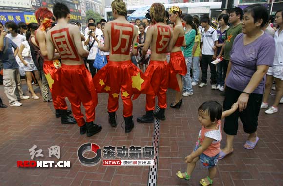 原來,5名自稱90后的男女,身上被涂彩繪,發(fā)型怪異,穿著國旗短褲,背上分別寫著“祖國萬歲”四個(gè)字,在這里搞行為藝術(shù)。另外一名妖艷女子,則在給路人發(fā)放紅色傳單。
