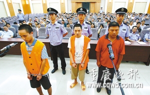 昨上午,南岸區(qū)人民法院審判長敲響法槌:“請值庭法警帶被告人吳貴平、傅顯國、吳成中到庭!