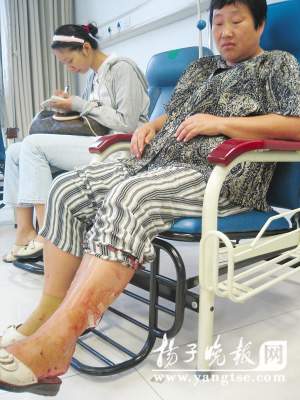 昨天中午一點(diǎn)多,記者接到市民報(bào)料稱,位于挹江門附近的四維新村小區(qū)里,一條瘋狗從六樓跳下后到處咬人,小區(qū)一位女士左腳被咬得血淋淋的,已經(jīng)送到南京市第二醫(yī)院去了。記者隨后立即趕到南京市第二醫(yī)院,“嚇?biāo)廊肆,我剛出門,就被一條大狗咬了!痹谀暇┦械诙t(yī)院,仍在接受治療的周大媽談起一個(gè)多小時(shí)前的情景仍心有余悸。據(jù)周大媽介紹,她住在四維新村小區(qū)一樓,昨天中午12:40,她吃完午飯想出門散步,剛出樓梯洞門,就遇上一條大狗,同時(shí)聽(tīng)到有人喊,“快回去”。周大媽瞄了一眼發(fā)現(xiàn)是警察在喊,心里直發(fā)慌,腿都開(kāi)始軟了。雖然周大媽急忙后退,但還是被大狗追上了。大狗露著尖牙,沖著周大媽的左腳狠狠咬了下去,接著又咬了周大媽的左腿。周大媽慘叫連連,最后嚇得渾身發(fā)軟。隨后,民警和保安趕到,將狗攆到一邊去了。