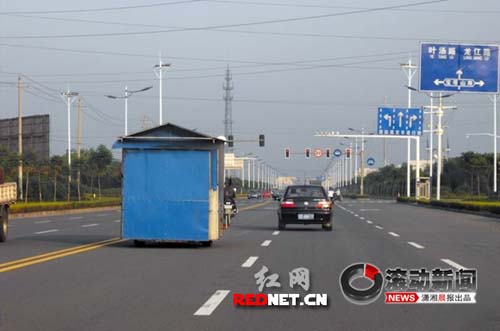 在帖文中配發(fā)了一組共5張照片,照片顯示,該房車正在機動車的超車道上行駛,從后面看去,像是建筑工地上剛搭建好的一座臨時用房,藍顏色的房車主體格外顯眼,一旁的行車道上還有一輛黑色的桑塔那3000型轎車幾乎在并駕齊驅(qū)。