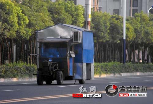 從房車的正面來看,該房的主體就完全顯露出來了,車的前部是一輛舊式手扶拖拉車,輪胎、水箱、傳動皮帶一應俱全;中部是駕駛室主體,跟街頭常見的殘疾車一樣。主要由駕駛室、前面檔風玻璃、觀后鏡,一樣都不少,更讓人稱奇的是這輛房車騎駛室頂端(即觀后鏡上方),裝著一臺空調(diào)掛機的主機,顯示這臺房車即便是在炎熱的夏天,也依然能照常使用。房車后部則是主體部分,鋁合金制的車廂、三角形車頂、兩個后輪,構(gòu)成一輛移動的房車。