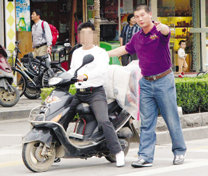 看到前方路口有交警執(zhí)勤,助力車手在車流中來個急剎車,然后匆忙掉頭,不顧危險加速逆向而去。相信不少市民都曾目睹過這驚險一幕,交警對此也顯得很無奈:不查處,快車道上的助力車時常惹禍;可一旦查處,往往會出現(xiàn)以上場景,十分危險!拔覀兿氲搅吮阋潞徒痪浜蠄(zhí)法這一招,一個在前,一個在后。”南京交警四大隊有關(guān)負(fù)責(zé)人昨天下午在查處現(xiàn)場告訴記者,從運用的效果來看,這招挺管用。不過被查處的市民則一肚子委屈,稱以為遇到壞人了,而且這也有“隱蔽執(zhí)法”的嫌疑。