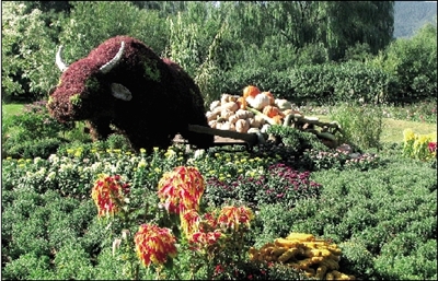 北海公園推出的廣式拼盆立菊是個(gè)“巨無(wú)霸”,是公園首次與菊花之鄉(xiāng)廣州小欖合作的罕見(jiàn)展品,直徑9米,高5米。骨架由鐵質(zhì)材料焊接而成層層環(huán)繞的60圈,以此表示對(duì)新中國(guó)60華誕的祝福,裱扎完成共使用菊花10980枝,紫色菊花裱扎的福、祿、壽躍于花間,與盤踞的飛龍交相呼應(yīng),突出了中華民族獨(dú)特的文化元素,精湛的裱扎技藝和恢弘氣勢(shì)盡顯立菊之王的風(fēng)姿。