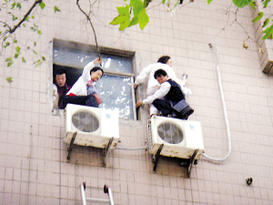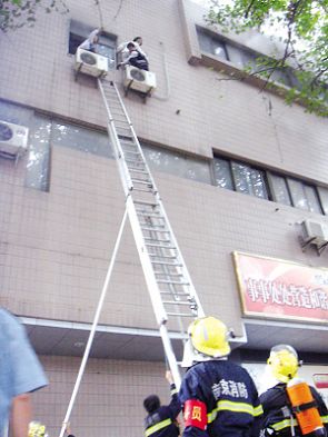 在發(fā)現(xiàn)大樓失火后,商務(wù)樓內(nèi)的物管立即報警求助。2點34分,消防人員、交警和120急救車趕到現(xiàn)場。在商務(wù)樓的西側(cè)兩個窗戶處,有幾位被困在樓內(nèi)的市民被濃煙嗆得站在窗口外呼救,由于煙霧太大,他們不得不爬出窗外,站在墻外的空調(diào)外機上等待救援。無法站立的這幾位市民一邊用手扶著寫字樓的外墻,兩只腳站在空調(diào)外機上,這一幕無不讓現(xiàn)場圍觀的群眾為他們捏了一把汗。等到消防隊員趕到現(xiàn)場之后,立即呼喊他們不要緊張,不要向下跳,在現(xiàn)場架設(shè)了云梯進行救援并成功地將四名被困市民解救了下來。