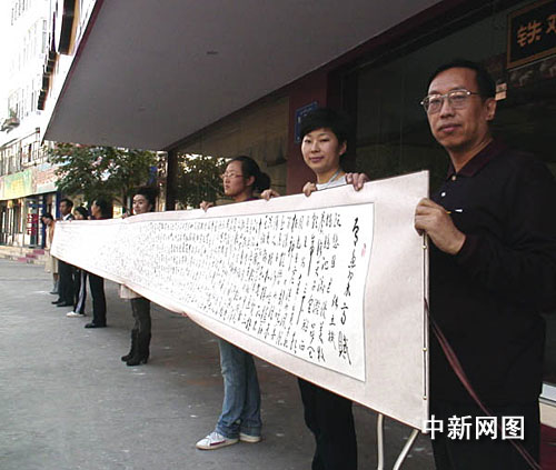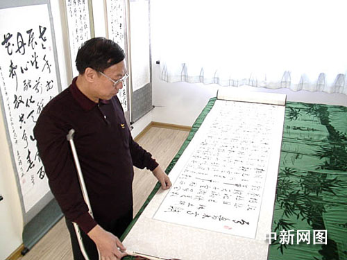中新網(wǎng)烏魯木齊9月24日電(王小軍)新疆烏魯木齊一殘疾人身殘志堅(jiān),閑暇之余,拿起手中的畫筆,書寫下一幅13米長卷,獻(xiàn)給新中國成立六十周年。