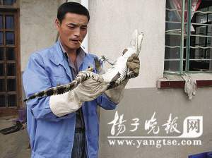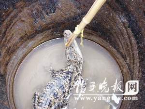 昨天上午,記者接到市民董先生的報料來到了江寧谷里孝義村111號,周國喜正蹲在一個大缸前,旁邊還有幾位村民在指指點點。記者走近一看,只見一只長約80厘米的小鱷魚正在缸底,頭部往上翹,尾部不停地甩動,看上去很緊張。盡管這條小鱷魚給周國喜帶來了不小的損失,可他沒有絲毫的恨意,反倒細心照顧起來!斑@個魚塘我一直在養(yǎng)魚,每年2月份和6月份都投放一次魚苗,總共1萬多條,鳊魚、鯽魚都有!敝車舱f,可讓他奇怪的是,產量都不高。周國喜曾研究過多次,可沒有任何結果,這讓他百思不得其解?删驮诮衲8月份的時候,周國喜在清理魚塘時,突然發(fā)現(xiàn)一只小怪物伸出了頭,嘴巴長又尖!熬褪撬耍耶敃r確定魚塘產量不高就是因為這只小怪獸!敝車哺嬖V記者,他自此開始盯著魚塘,可小怪獸很警惕,大都在魚塘底,很難發(fā)現(xiàn)。功夫不負有心人,通過近半個月的觀察,周國喜發(fā)現(xiàn)小怪獸喜歡上岸睡覺,不過是在對岸的水花生上面,很難捕捉!拔舶秃荛L,嘴很尖,身上顏色黃黑相間!敝車舱f第一眼看到小怪獸就覺得像是鱷魚,不過他不敢確認,于是喊來了弟弟,結果弟弟覺得像是國家一級保護動物揚子鱷。
