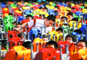 在二十七中和奮斗小學(xué)的表演團(tuán)隊(duì)都有替補(bǔ)隊(duì)員。“哪個(gè)坐標(biāo)點(diǎn)缺人了,他們就會立刻補(bǔ)上去,所以說他們要組的字和圖案比較多,可以說每一個(gè)動作都要會!边@些替補(bǔ)隊(duì)員在不上場的時(shí)候,還要在隊(duì)列之間進(jìn)行巡視,查看道具,提醒同學(xué)做動作。另外修道具也是他們的一項(xiàng)重要工作,為此表演的同學(xué)們都叫這些替補(bǔ)隊(duì)員為“小師傅”。
