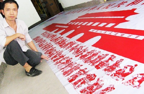 二十四日,記者看到,該剪紙長約十米,寬兩米,以紅白兩色為主,線條活潑流暢,人物形態(tài)逼真。剪紙上方為“熱烈慶祝中華人民共和國成立六十周年”十七個大字;中間接紅色天安門城樓,顯得巍峨壯觀;再往下是天安門廣場,五十六個民族的代表分兩行排列,身著獨具民族特色的服飾,或歡歌或舞蹈,五十六個民族團結(jié)一致、喜迎國慶之情躍然于紙上。