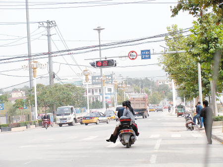 10月8日,一位從華山大街向東行的外地司機(jī)把車停在民生街丁字口的紅燈前,不知道如何是好。原來前方的紅燈亮著,但是旁邊的藍(lán)牌子上卻寫著“紅燈亮?xí)r 直行通過”,他看著身邊的車既有飛馳通過的,還有停車觀望的,更多的是半停半走猶豫不決的。所以不知道該怎么辦。而渭南的出租車司機(jī)老胡說,這個紅綠燈堪稱“最!,設(shè)立得根本就不科學(xué),設(shè)立這么一個牌子,難道旁邊還要再加個牌子說綠燈亮?xí)r繼續(xù)通行?當(dāng)?shù)厝舜蠖济靼,這個紅綠燈設(shè)立的目的是限制向北拐的,只要把紅綠燈設(shè)置個向北的箭頭就可以了,而弄個紅燈加個說明有些自相矛盾。記者查閱《中華人民共和國道路交通安全法》,第二十六條規(guī)定:“交通信號燈由紅燈、綠燈、黃燈組成。紅燈表示禁止通行,綠燈表示準(zhǔn)許通行,黃燈表示警示!
