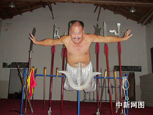 中新網(wǎng)永春10月12日電 (林永傳 顏堯民 施由森)以腹部作為支點,雙腳支在鐵欄上,然后整個人身體懸空,普通人一般無法做到這點,而福建永春縣白鶴拳師顏大石卻可以以鋒利的鋼叉作為支點,整個人懸空,其白鶴內功令人叫絕。
