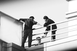 在該大廈樓頂?shù)奈髂辖,一男子站在樓頂護欄外,雙手握著欄桿,并不時扭動著身體。為避免該男子情緒波動,警方一邊勸說該男子,一邊疏散圍觀群眾。