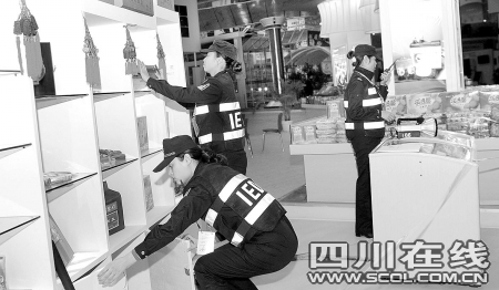 昨晚10點(diǎn),新會(huì)展中心各展館里一片忙碌。在一群正在安檢的帥氣黑衣特警中間,3個(gè)扎著發(fā)髻的女特警格外引人注目。除負(fù)責(zé)現(xiàn)場(chǎng)指揮的教導(dǎo)員吳虹外,28歲的羅蕾正用伸縮臂鏡檢測(cè)著一食品展臺(tái)頭頂?shù)闹,而今年剛(cè)刖闹苋,則彎腰在一排展柜前仔細(xì)檢查著。和男特警一樣,她們都穿著帥氣的黑色警服,戴著警帽,不施粉黛,右胸前印有“成都特警”4個(gè)大字的閃光背心,將她們襯得格外颯爽。