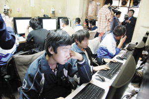 中午11點半左右,網(wǎng)吧涌進十幾個穿著八十九中校服的學(xué)生,孩子們很熟悉地朝胖女子打著招呼,喊了聲“姑姑,開機”,胖女子便忙活著收過錢后,一一為孩子們開機。由于機器有限,沒爭到電腦的學(xué)生只能站在后面一邊看,一邊搭話聊天,不舍得離開。記者看到,為了趕時間,很多孩子都著帶盒飯,邊吃邊玩。有些沒有帶盒飯的孩子,一邊緊張地打著游戲,一邊叫胖女子泡一碗方便面,匆匆吃幾口,又開始進入游戲中。下午4點20分左右,身穿校服的孩子們再次大量涌入,為了不被家長發(fā)現(xiàn),有些孩子甚至將自行車搬進了網(wǎng)吧。