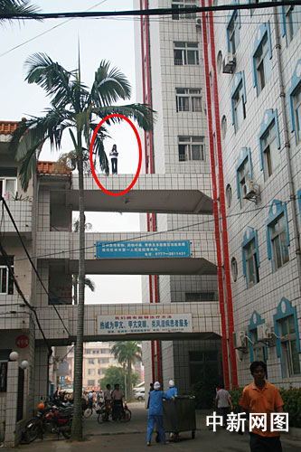 當(dāng)日早上7時(shí)40分,欽州市消防支隊(duì)接到報(bào)警,第一人民醫(yī)院天橋有一名女子跳樓。接到報(bào)警后,支隊(duì)迅速調(diào)集2臺(tái)搶險(xiǎn)救援車(chē)前往施救。當(dāng)消防官兵趕到現(xiàn)場(chǎng)時(shí),醫(yī)院天橋兩旁圍有很多圍觀群眾,一名年輕的女子站在天橋上面,手里拿著筆和筆記本,正在不停地寫(xiě)著東西,不時(shí)地緊張地看看周?chē)娜巳。?jù)當(dāng)時(shí)就診的醫(yī)生介紹,這名欲跳樓女子,早上同媽媽一起來(lái)到醫(yī)院婦產(chǎn)科檢查,發(fā)現(xiàn)這名女子已經(jīng)懷有身孕,后來(lái)不知怎么就要跳樓了。當(dāng)日值班保安說(shuō),這名女子在上面已經(jīng)很久了,她媽媽也不敢上去,醫(yī)院已經(jīng)想了很多辦法,一接近她,她就揚(yáng)言要跳樓。