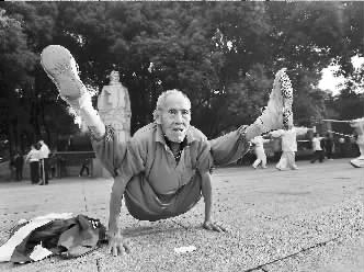 肖爹爹說(shuō),1982年離休后,身體每況愈下,還患上了肩周炎,便開(kāi)始鍛煉身體。當(dāng)年播出《射雕英雄傳》后,他就迷上了變幻莫測(cè)的蛤蟆功,—練就是27年,身體也日漸結(jié)實(shí)。 記者周超攝