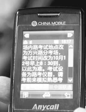“場地考試點(diǎn)改為方興路分考場,請于10月1日至8日早上8:30到考場進(jìn)行場內(nèi)路模擬,合格后方可參加考試!眹鴳c節(jié)前夕,很多參加駕駛證直考的考生收到了這樣一條短信,短信后附有考試地址和聯(lián)系電話。