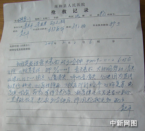 記者在南和縣人民醫(yī)院見到陳雪川的“搶救記錄”,記錄顯示:主因突發(fā)性意識喪失約30分鐘,于2009年11月2日6時(shí)05分入院,入院查體,意識喪失,大動脈搏動消失,雙瞳孔約5mm,固定,心音消失,呼吸音消失,心電圖為直線,初步診斷為心源性猝死,入院后給予綜合搶救,電復(fù)率4次后患者心跳一直未能恢復(fù),搶救30分鐘后,終因搶救無效,死亡。