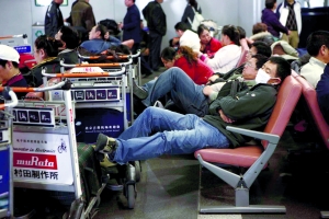 受降雪影響,昨日,首都國(guó)際機(jī)場(chǎng)部分航班延誤或取消,大批乘客滯留。
