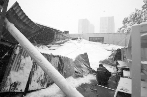 昨日15時許,裕華路與西二環(huán)交叉口一個建筑工地,漫天大雪讓工人們無法開工。忽然只聽“嘩啦”一聲巨響,工人張先生看到,他們的廚房——一座四五十平方米的活動板房從根部倒塌,鍋、灶、蔬菜等都被壓在了下面!爱(dāng)時里面沒有人,所以沒人受傷!睆垘煾嫡f,這個廚房負(fù)責(zé)100多人的伙食,這下子晚飯沒了著落。