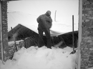 這個養(yǎng)殖場位于宋營村村南,是村民郎鳳聯(lián)家的。昨天17時許,記者在現(xiàn)場看到,養(yǎng)殖場約600平方米,四周是磚砌的圍墻,頂部是用鋼筋支撐的彩鋼板架設(shè)的。整個養(yǎng)殖場的頂部都已坍塌,彩鋼板上已經(jīng)積了一尺多厚的雪。在養(yǎng)殖場的圍墻外,可以聽到豬的叫聲。郎鳳聯(lián)的家人爬到坍塌的彩鋼板上,正在想辦法搶救被壓的牲畜。因為雪很沉,他們搶救了一個多小時,才救出一只羊。
