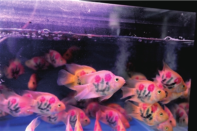 記者走訪了位于高碑店附近的幾個(gè)水族區(qū),發(fā)現(xiàn)都有這種文身魚(yú)出售。這種魚(yú)有成人手掌大小,魚(yú)身上刻有玫瑰花和各種寓意發(fā)財(cái)吉祥的圖案。文身魚(yú)主要有兩個(gè)品種,一種叫“鸚鵡”的紅黃色熱帶魚(yú),另一種是有著兩條長(zhǎng)長(zhǎng)胡須的白色“招財(cái)魚(yú)”。