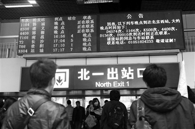 受10日以來石家莊暴雪影響,經(jīng)京廣線進京的列車大面積晚點。昨天(11日),共有124趟進出北京西站的列車晚點,大量旅客的行程受到影響。為此,北京西站啟動應急響應,開放全部候車大廳,旅客可選擇全額退票。 昨天下午4點多,記者在北京西站進站大廳內看到,顯示屏上有17趟從西站始發(fā)的列車顯示為晚點,還有7趟列車未標明發(fā)車時間。在屏幕下方,滾動字幕顯示晚點列車信息。各個候車室外均增加了鐵路工作人員,負責維持秩序并做解釋工作。
