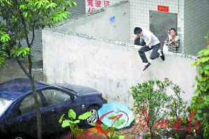 輪到女孩子時(shí),后面的男士則在后面助推一把。記者遠(yuǎn)遠(yuǎn)望去,一位穿著裙子的女孩不顧“走光”的尷尬,在男友推托下爬上墻頭,卻不敢跳到墻外,而后面的人卻不斷地催促她,“快點(diǎn)快點(diǎn),你不跳我們還要跳呢”,騎在墻頭的她上下不得甚是尷尬。最終,她腳踩到墻頭的一輛轎車,才安全落到地面,弄得轎車“滴滴”叫了很久,車主聞聲趕來心疼得直咧嘴。