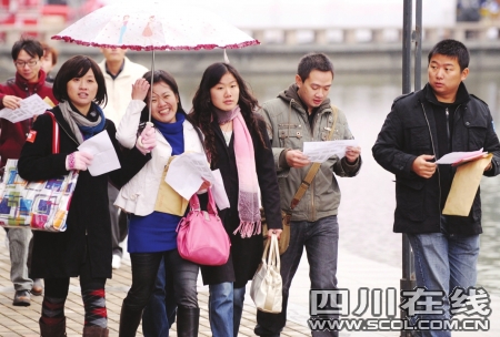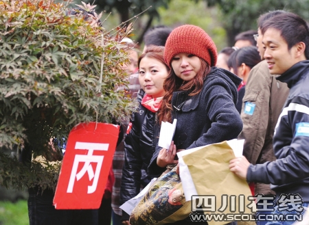 “喝著鹽水聊天!喝著鹽水聊天!有沒有人接暗號。俊薄罢f話凈閑(咸)扯!終于找到你們了!弊蛉障挛3點(diǎn),成都高新區(qū)大型公益單身青年聯(lián)誼會在有趣的拓展訓(xùn)練中拉開帷幕。盡管是周末,但高新區(qū)孵化園露天中心廣場卻人頭攢動,好不熱鬧。三人一組的單身白領(lǐng)冒著冬雨,頂著寒風(fēng),站在現(xiàn)代化的樓宇間,口里齊聲喊著一些奇怪的詞組。原來,現(xiàn)場趕來的600多名單身青年們隨機(jī)分成了若干小組,正在參加moving&meeting(找朋友)的拓展游戲。通過地圖找到指定地點(diǎn),喊著接頭暗號,兩個陌生的小組重新組成一個大組,然后進(jìn)行新一moving&meeting(找朋友)游戲。最終8個三人小組組成了一個團(tuán)隊,原本陌生的24個人在游戲中相互認(rèn)識、一起完成游戲任務(wù)。隨即,團(tuán)隊間進(jìn)行了“幸福團(tuán)團(tuán)轉(zhuǎn)”、“迎接新娘”等趣味游戲。