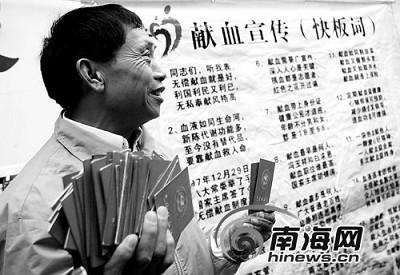 “我健康我獻(xiàn)血,你捐血你快樂,救人生命積功德……”在海口明珠廣場(chǎng),省血液中心采血車旁,穿著樸素的楊順德,操著四川口音、拿著半導(dǎo)體喇叭重復(fù)地向人們宣傳獻(xiàn)血的好處和獻(xiàn)血知識(shí)。