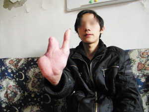 “我當時疼極了!看到自己的4根手指已經(jīng)沒了,我心里特別害怕!”在這條生產(chǎn)線上工作的,都是小東的親屬。事發(fā)后,在舅姥爺?shù)膸ьI(lǐng)下,親屬們緊急將小東送到附近醫(yī)院。公司老板此時也得知了情況,并讓小東親屬將其轉(zhuǎn)到天津醫(yī)院進行治療。在搶救期間,小東的親屬將找到的四根手指帶到了醫(yī)院。但因為手指已碎,而且粘上了很多橡膠,已經(jīng)無法進行再植手術(shù)了。住院十余日后,小東出院了。看著只剩下半個手掌的右手,小東多次掉下眼淚。