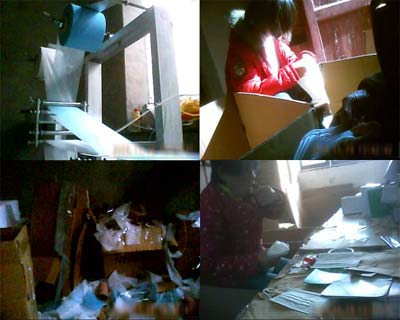 記者看到這里正在進(jìn)行包裝,在這個(gè)所謂的廠(chǎng)家里生產(chǎn)衛(wèi)生用品的工人們,沒(méi)有一個(gè)人穿著工作服,戴工作帽,包裝封口的機(jī)器,也是幾根木條定在一起,就湊合著用了,最出乎記者意料的,還不是這些簡(jiǎn)陋的生產(chǎn)環(huán)境,而是包裝口罩的工人極不規(guī)范的動(dòng)作,看到這個(gè)阿姨一邊蘸著唾沫一邊包裝口罩的手法,讓記者不禁為那些可能會(huì)戴上這包口罩的人感到擔(dān)心。