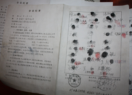 該《會議紀(jì)要》還稱:“全村村民代表總數(shù)30人,參加會議村民代表總數(shù)26人,占全村村民代表總數(shù)87%。”其后,在“同意征收集體土地的村民代表并按手印如下”之后,便有26位村民代表簽字和按的手印!稌h紀(jì)要》最后還有村委會和雙橋區(qū)國土資源局兩個部門的負(fù)責(zé)人的簽字和公章。